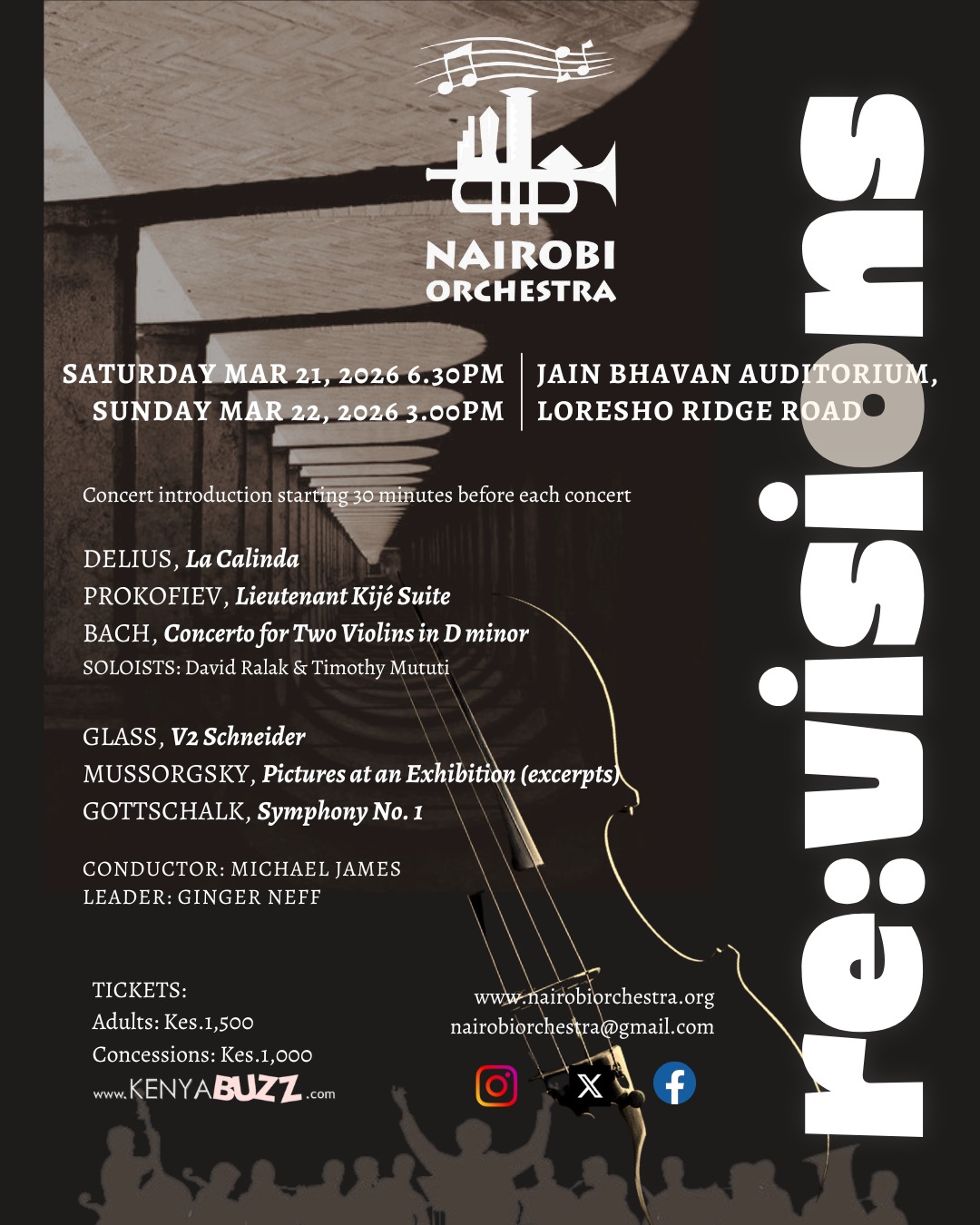 Nairobi Orchestra presents RE:VISIONS — a vibrant programme exploring how composers re-imagined musical ideas across cultures, eras, and art forms. From Delius’ evocative La Calinda and Prokofiev’s cinematic Lieutenant Kijé, to Philip Glass’s symphonic reworking of David Bowie and Gottschalk’s groundbreaking samba-infused Symphony No. 1, the concert highlights rhythm, revision, and fresh perspectives. Mussorgsky’s Pictures at an Exhibition appears in its brilliant orchestral form, alongside Bach’s visionary Double Violin Concerto, featuring soloists David Ralak and Timothy Mututi. Many of these works are rarely heard in Kenya, offering the audience bold sounds and new horizons.